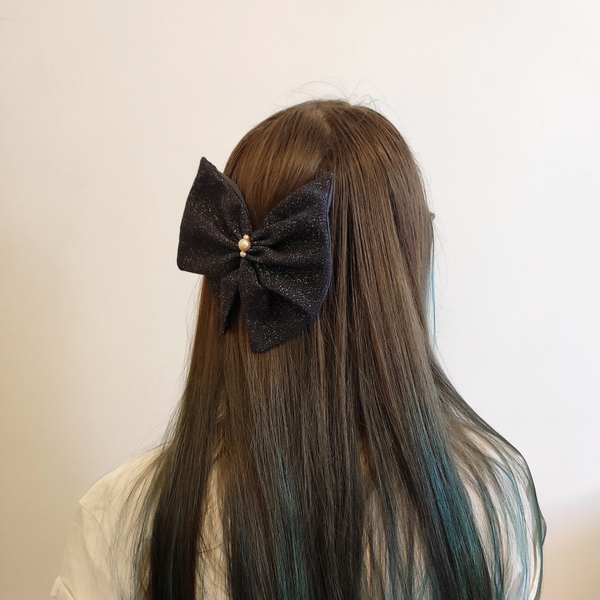 Hair ribbon made from Craftine sequined jersey and satin fabric and embellished with pearls (both second hand, but never used before). In a crocodile hair clip.