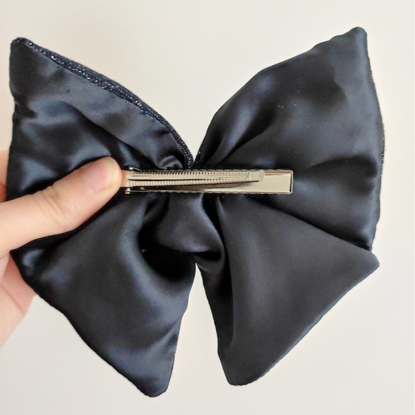 Ruban à cheveux fait dans un jersey pailletté de chez Craftine et un tissu satin et orné de perles (les deux sont de seconde main, mais jamais utilisé avant). Dans une pince à cheveux crocodille.